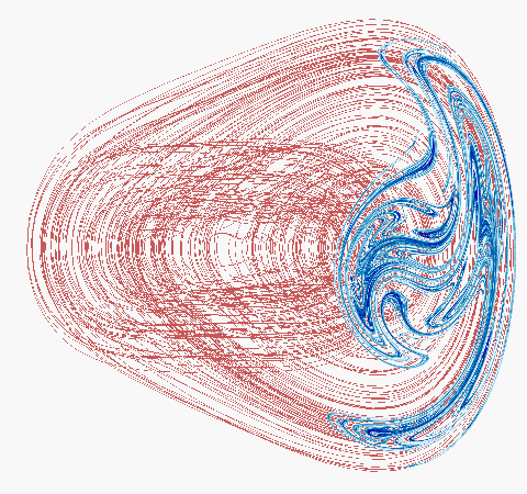 A chatic attractor (Red line) with its Poincare mapping (Blue points)